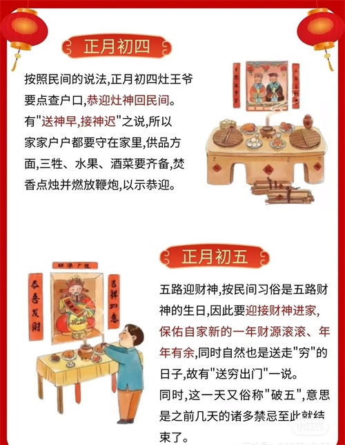 正月初四是迎灶神的日子。灶神是家庭的保护神,负责守护家中的平安和福祉。在这一天,人们会在家中举行祭灶仪式:
