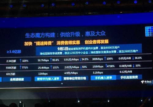 中国电信董事长杨杰27日在广州举行的第九届“天翼智能生态博览会”上表示,近年来中国电信加快“提速降费”工作步伐,宽带接入速率连续两年累计提升了3.65倍,宽带接入平均单价连续两年累计下降了81%;手机流量平均单价连续两年累计下降了57.4%。中国电信将于9月1日起,全面取消手机国内长途、漫游费,预计将惠及8000万用户。此外,电信还将大幅降低国际及港澳台长话资费以及数据漫游资费。
