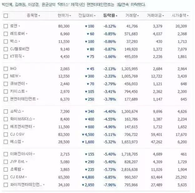 据娱乐资本论调查从传言开始的近三天的韩国股市,JYP跌了5.4%,市值缩水97亿,SM跌了4.8%,市值缩水314亿,CJ E&M跌了8.99%,市值缩水2444亿,YG跌了11.98%,市值缩水760亿……