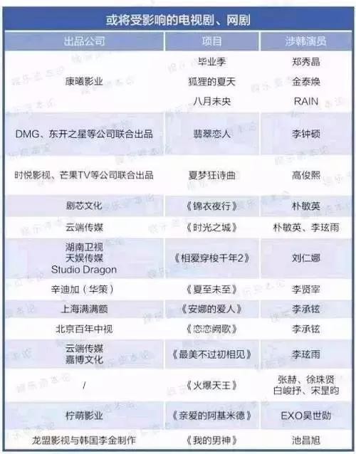 演员刘仁娜在《相爱穿梭千年2》即将结束拍摄之前,被告知要求下车;电视剧《任意依恋》的主演金宇彬、秀智原定6日举行的粉丝见面会也被无限期延期,EXO8月底举行的上海演唱会,目前被爆取消。