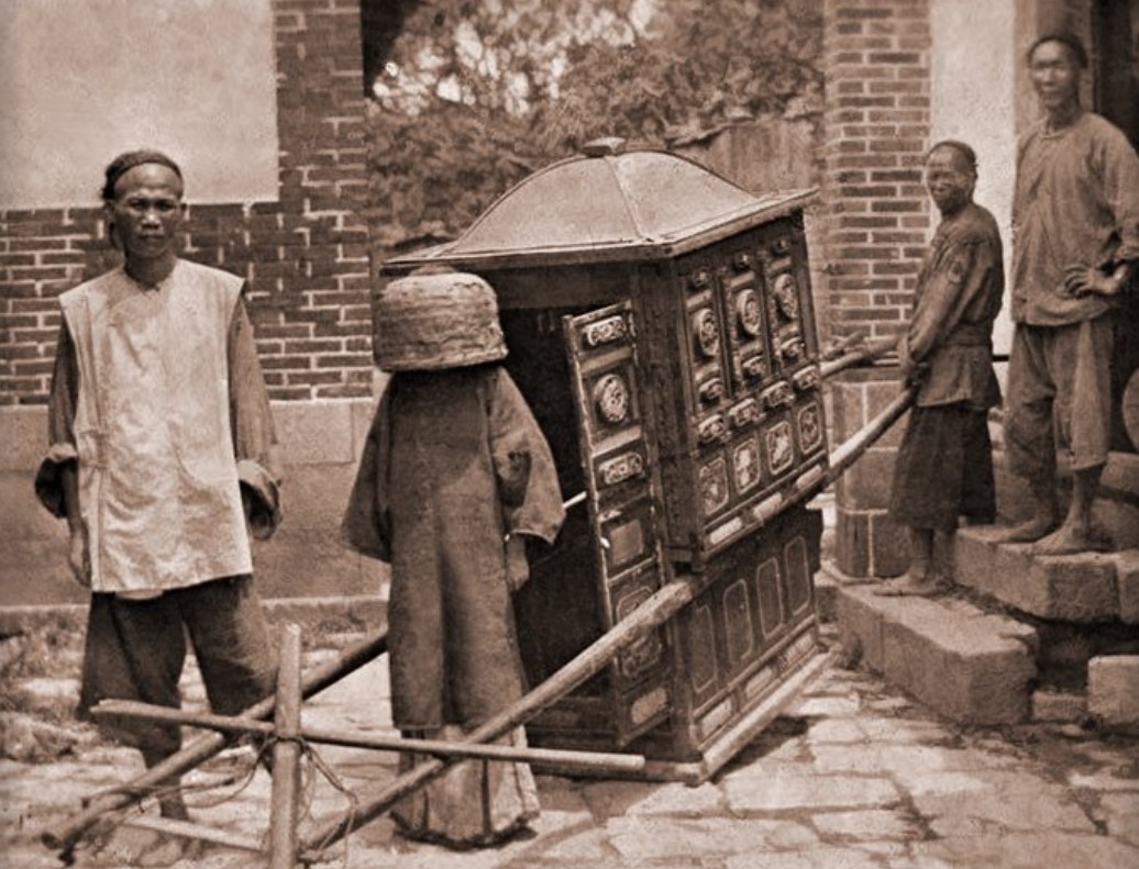 一位新娘准备上轿。通常,新娘会用红色的面纱遮住她的脸。目前还不完全清楚这个女人为什么要使用篮子。
