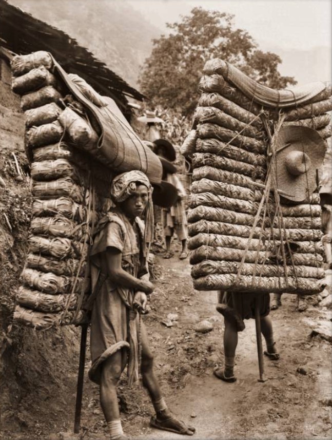 农民背着茶砖。他们背上的茶砖重达130多公斤。这些人通常不得不步行180公里来运送货物,所有的重量都在他们的背上,