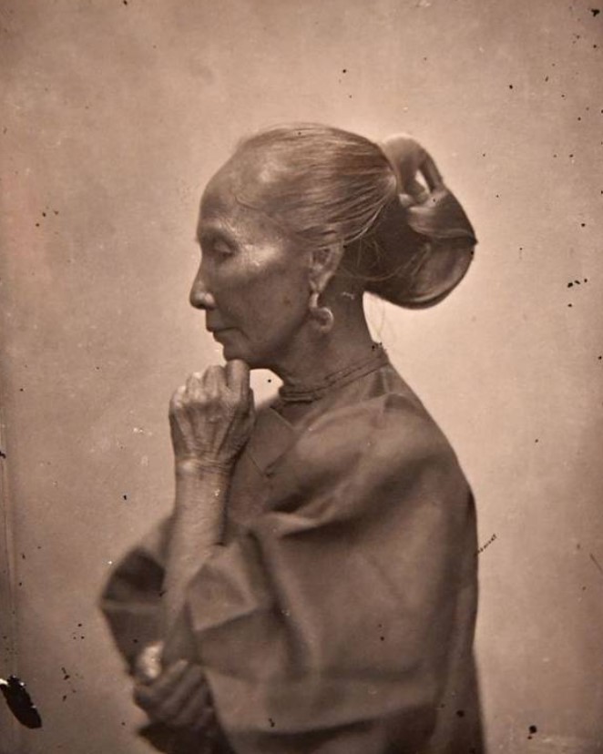 一位绑着传统发型的老妇人在侧面摆姿势。