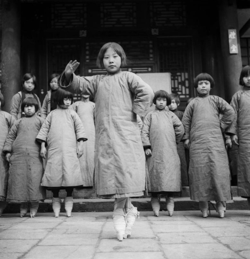 年轻女孩在北京的一所戏剧学校练习京剧。她们的脚被缠住了。