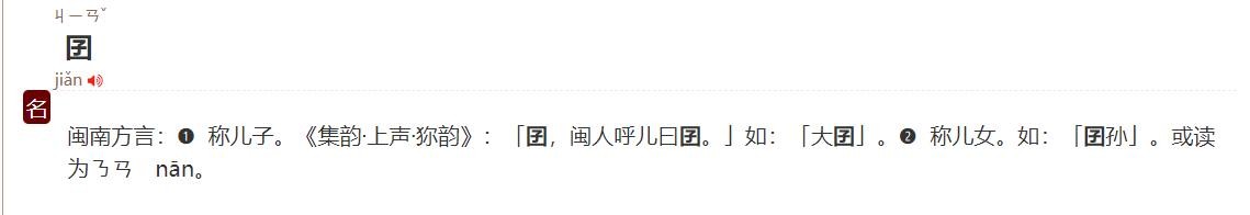 具体来说,【nān】读音在方言中通常表示小孩,与“囡”字有类似的含义。而当“囝”字读作【jiǎn】时,它则代表着儿子或儿女。