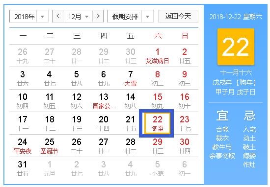 2018冬至时间:2018年12月22日,星期六,农历戊戌年(狗年)冬月十六。