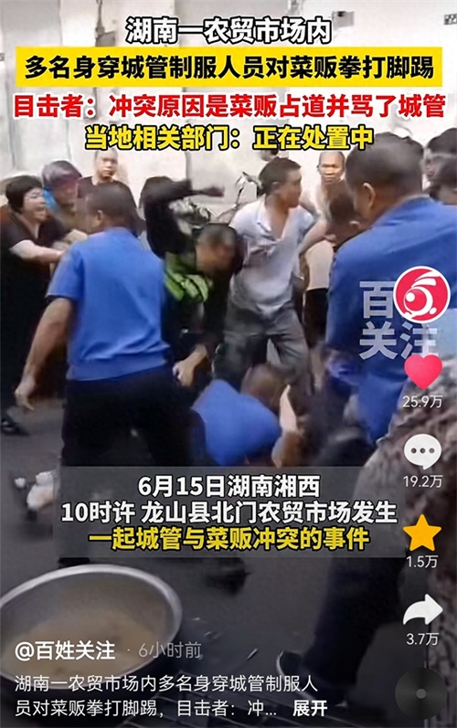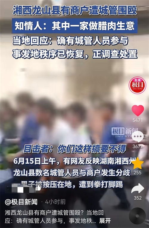 根据龙山县城管局的回应可知,6月15日上午8点多,城管执法人员像往常一样开展执法巡逻,在这个过程中发现有商户出店经营。