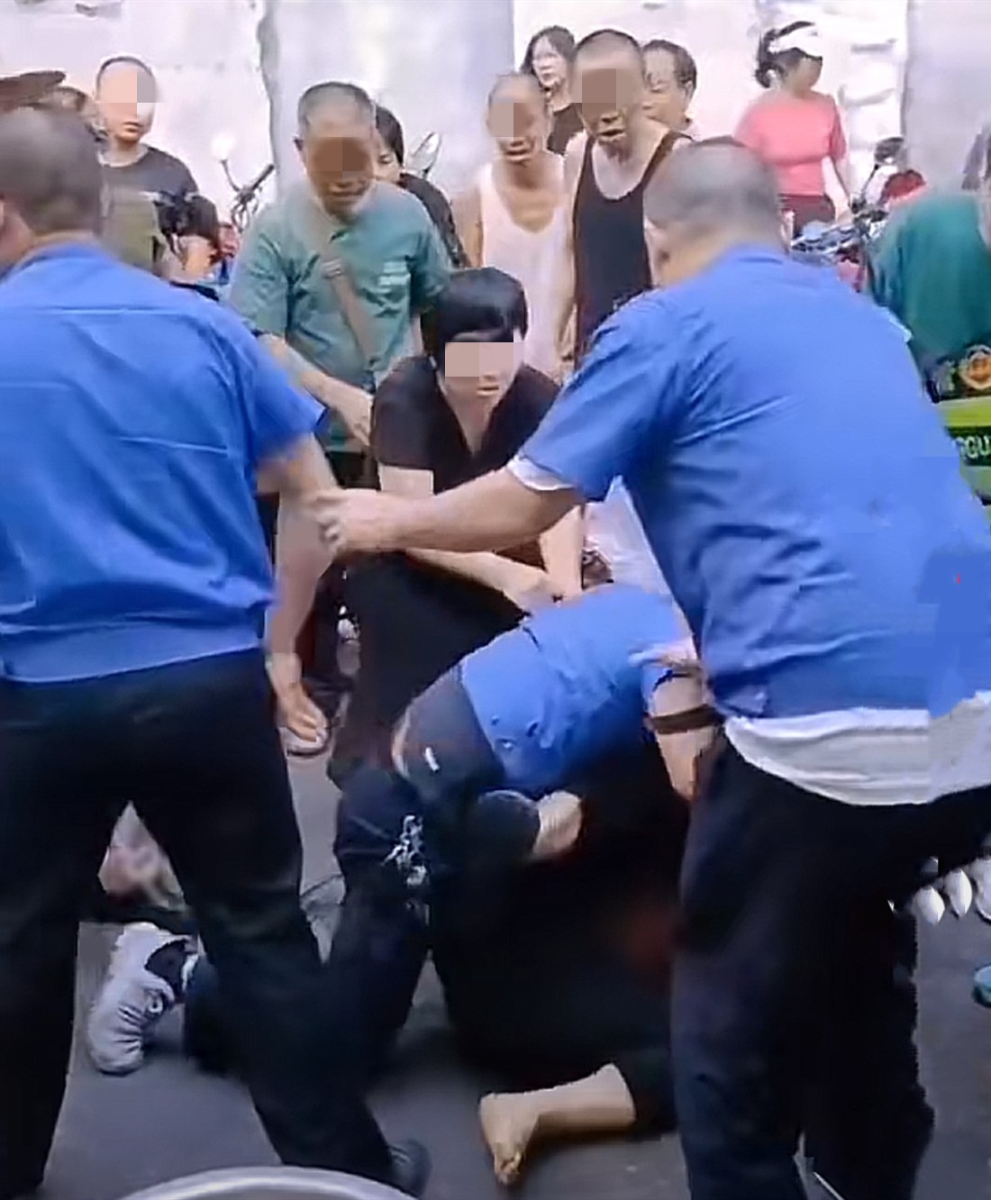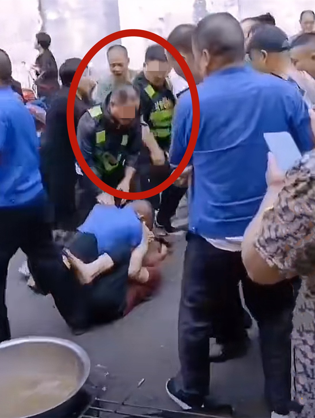 有人用拳头猛捶男子的头部,甚至还不小心打到了按压男子的城管身上。