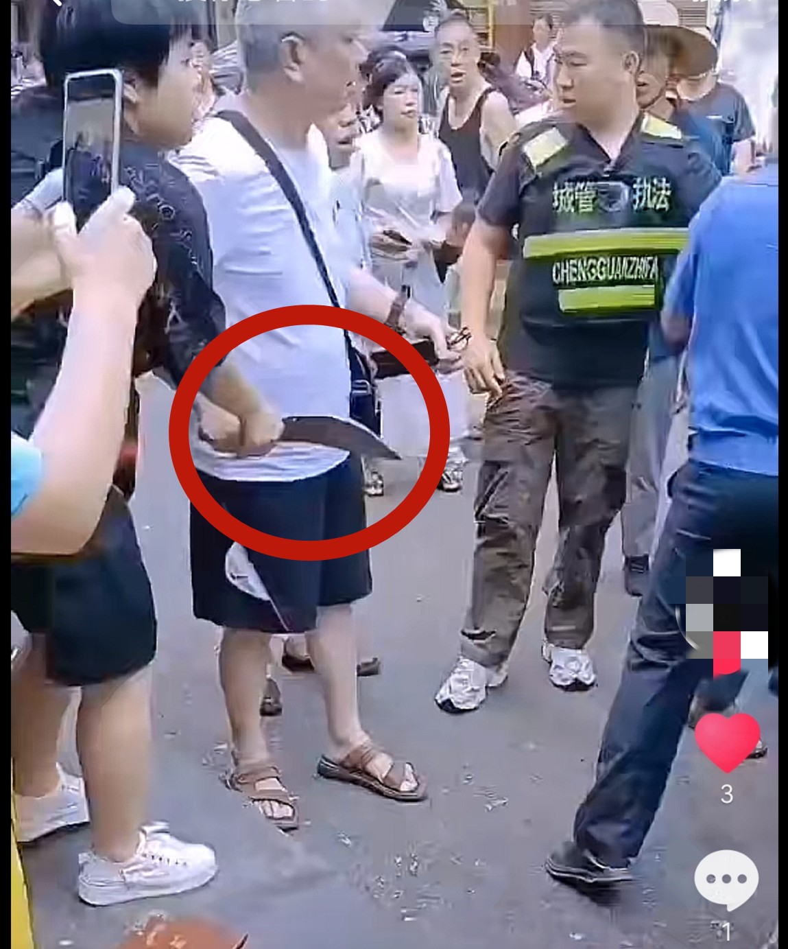 从视频中看到,在混乱之中,一名穿着白色短袖,黑色短裤的大爷拿着一把刀出现在了现场。