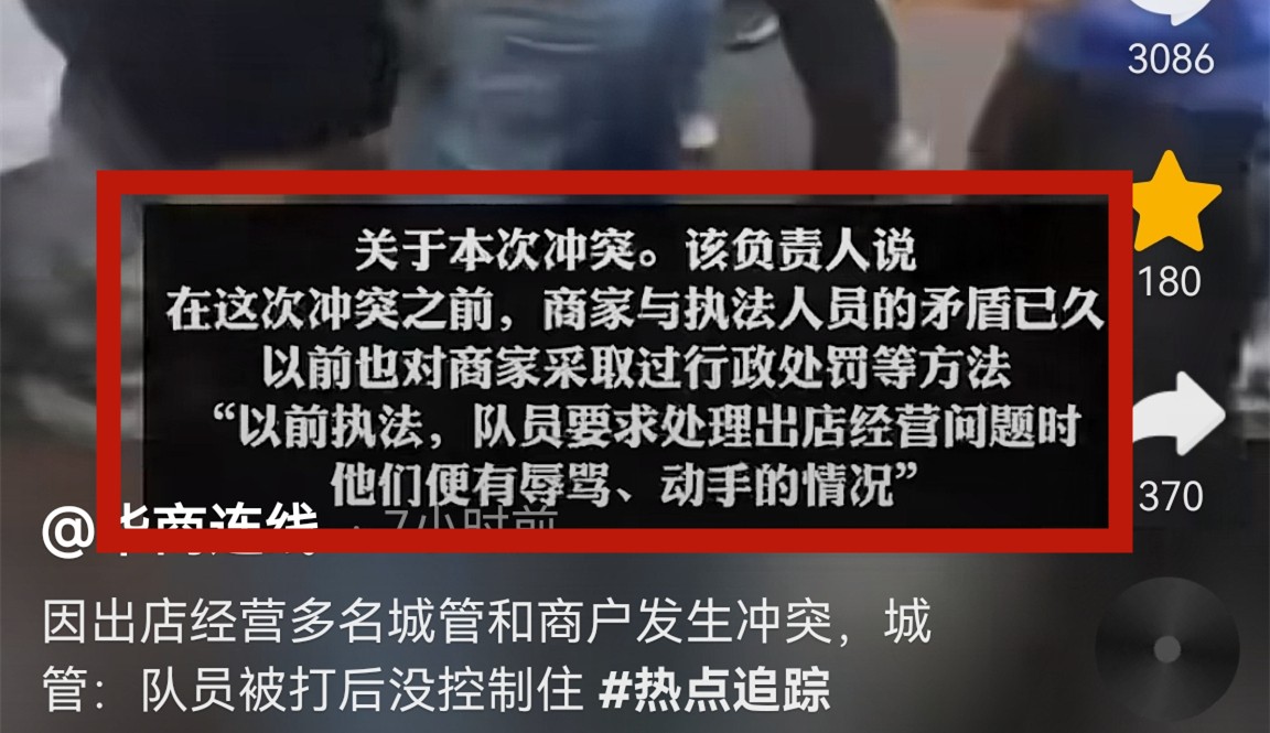 在这之前城管就对涉事商家进行过行政处罚。城管要求对方处理出店经营问题时,商户便有辱骂和动手的情况。