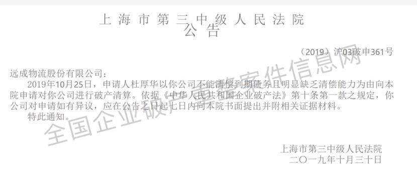 南都记者获悉,11月1日,依据全国企业破产重整案件信息网消息,上海市第三中级人民法院发布公告,申请人杜厚华以远成物流股份有限公司(以下简称远成物流)不能清偿到期债务且明显缺乏清偿能力为由,向该法院申请对远成物流进行破产清算。