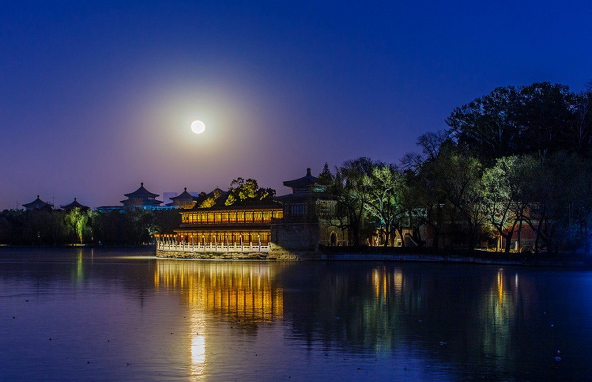 北海公园,位于北京市中心区,城内景山西侧,傍晚的北海,通明的白塔倒映在湖光里。水光艳艳,宁静的不可思议。北海公园的夜景拍摄,可以从3个点来进行,白塔是北海公园的标志性建筑,拍摄时间基本上在太阳下山后的30-45分钟之间,岛圆廊部分基本上是在太阳落山后45-70分钟左右的时段拍摄的,五龙亭拍摄时段在35-70分钟之间。
