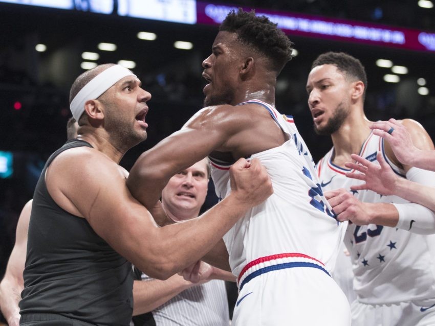 2019年4月21日,在篮网对阵76人的季后赛系列赛G4中,恩比德放倒了上篮的贾勒特·阿伦,篮网球员杜德利立马冲上来推搡恩比德为小弟讨回公道,那时还在76人的吉米·巴特勒立刻推开杜德利,之后双方在底线乱作一团,最后工作人员拉开冲突主要人员——JB和杜德利,才没有使事态进一步恶化,最终杜德利和巴特勒被驱逐,恩比德被吹一级恶意犯规。