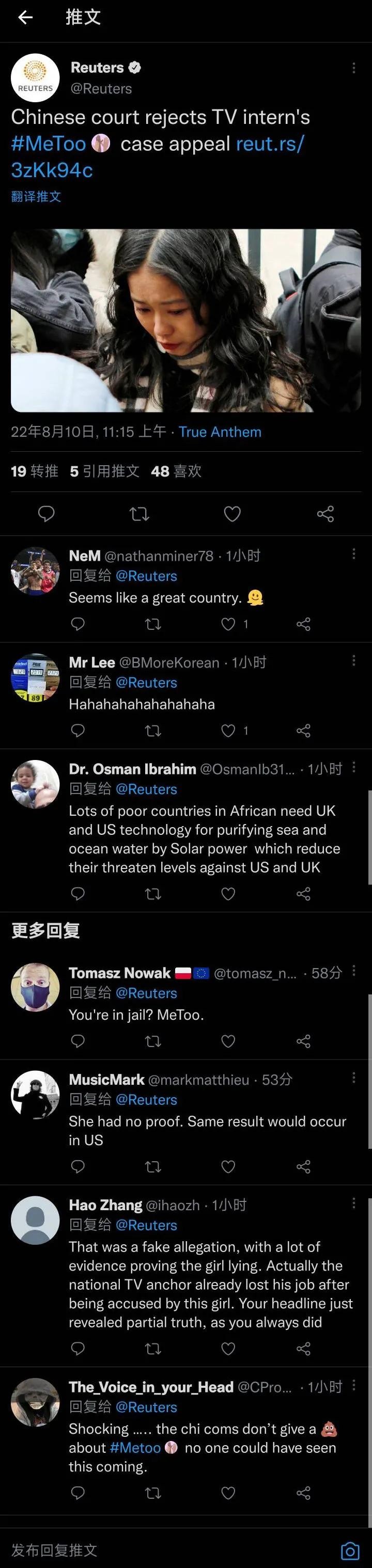 网友评论:一拳揍没了朱军的职业生涯,揍出路透社编辑素材,弦子和她背后的团体名利双收。