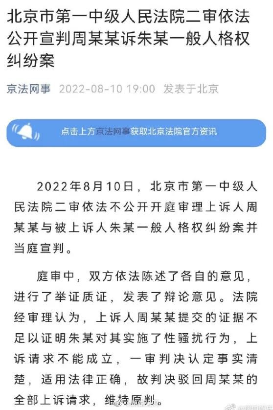 朱军周晓璇案二审宣判,驳回周晓璇上诉,终审朱军胜诉。驳回周某某全部上诉请求维持原判,上诉人周某某提交证据不足证明朱某实施性骚扰行为,一审判决认定事实清楚,适用法律正确,故判决驳回周某某全部上诉请求维持原判。