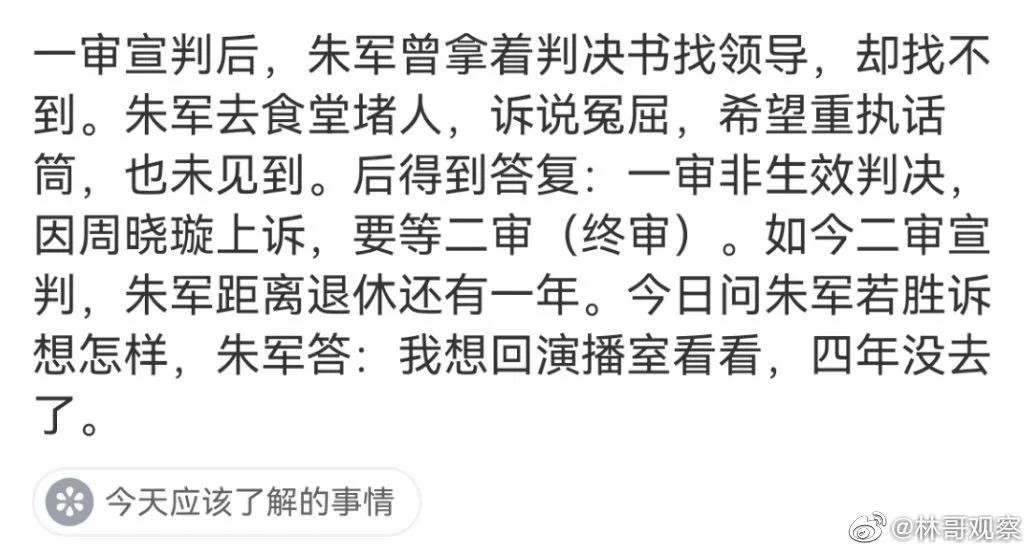 一审宣判后,朱军曾拿着判决书找领导却找不到。朱军去食堂堵人诉说冤屈,希望重执话筒未见到。后答复:一审非生效判决,要等(终审)。二审宣判了朱军距退休还有一年。有人问朱军若胜诉想怎样,朱军答:我想回演播室看看四年没去了。