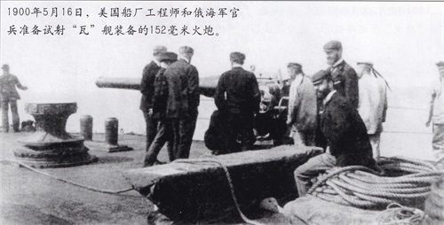 1900年5月16日,美国船厂工程师和俄海军官兵准备试射“瓦”舰装备的152毫米火炮。