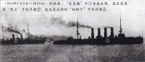 图示:1904年2月8日11时20分,济物浦,“瓦良格”号①准备出港,其后是英国“猎犬”号巡洋舰②,远处是法国的“帕斯卡”号巡洋舰③。