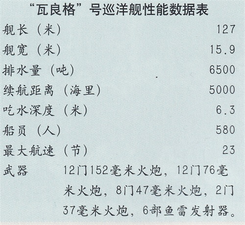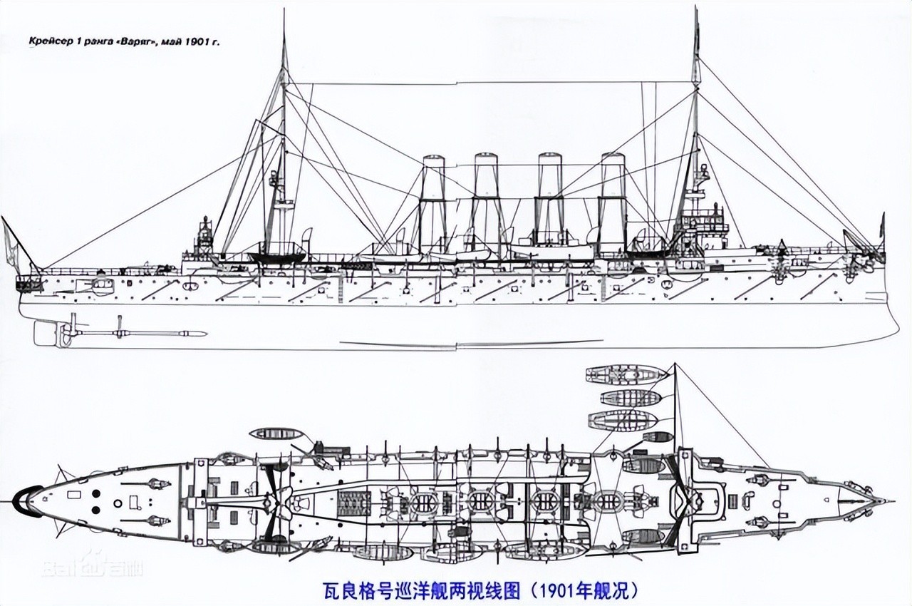 “瓦良格”号是俄国第一艘装甲巡洋舰,被认为是当时俄国最优秀的战舰之一,尤其是安装在上层甲板的火炮威力巨大。排列紧凑的4根大烟囱也成为“瓦良格”号的标志。