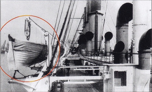 从后段甲板左侧舰桥上拍摄的“瓦”舰照片,可以看到远处放艇甲板上纵向存放着救生舢舨。