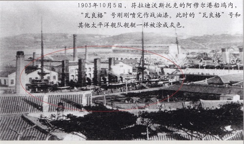 图示:1903年10月5日,符拉迪沃斯托克的阿穆尔港船坞内,“瓦良格”号刚刚喷完作战油漆。此时的“瓦良格”号和其他太平洋舰队舰艇一样被涂成灰色。