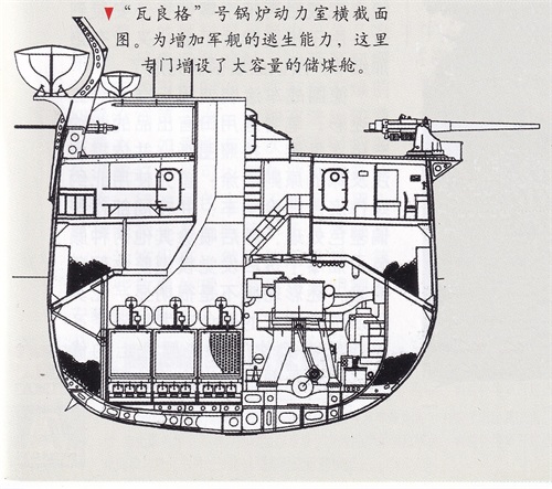 “瓦良格”号锅炉动力室横截面图。为增加军舰的逃生能力,这里专门增设了大容量的储煤舱。