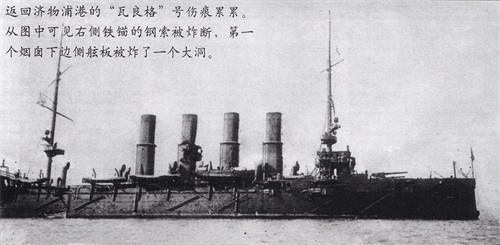 返回济物浦港的“瓦良格”号伤痕累累。图中可见右侧铁锚的钢索被炸断,第一个烟囱下边侧舷板被炸了一个大洞