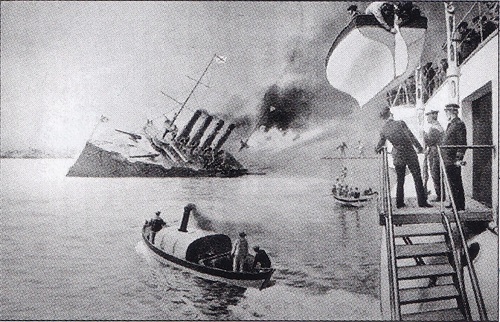 无力再战的“瓦良格”号放水自沉,舰组人员搭乘小艇撤离。图为反映英国军舰派汽艇接收俄军官兵的画面。