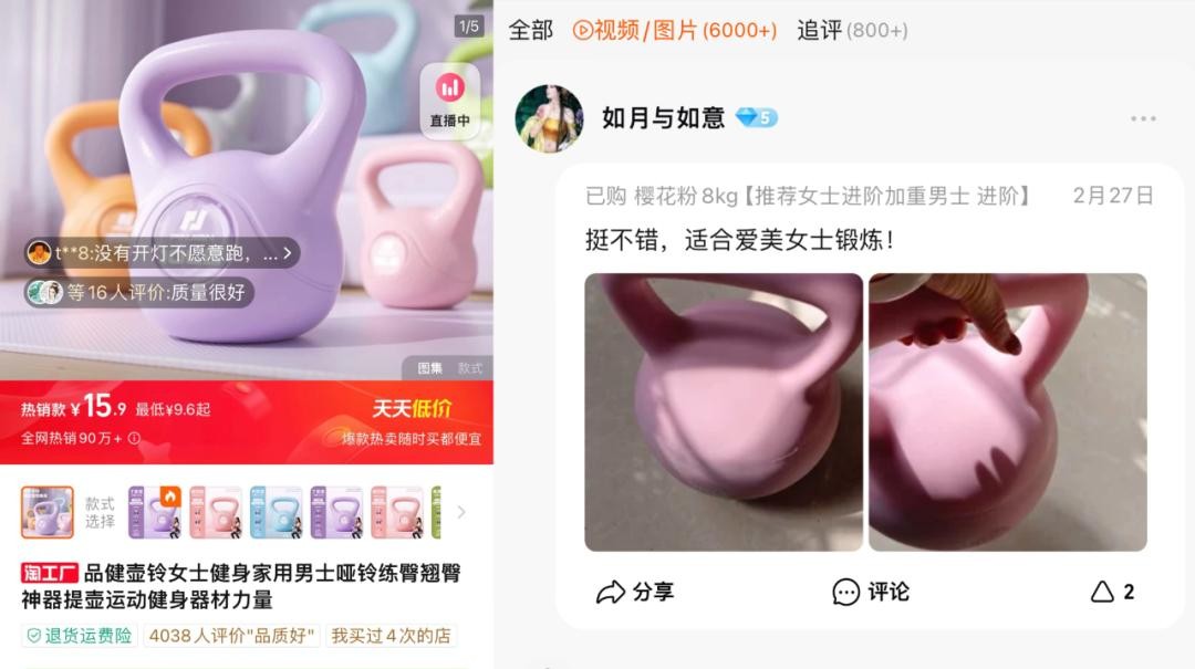 打开淘宝,逛逛商品页、评论区,也会发现,力量型运动早就不再是男人的天下: