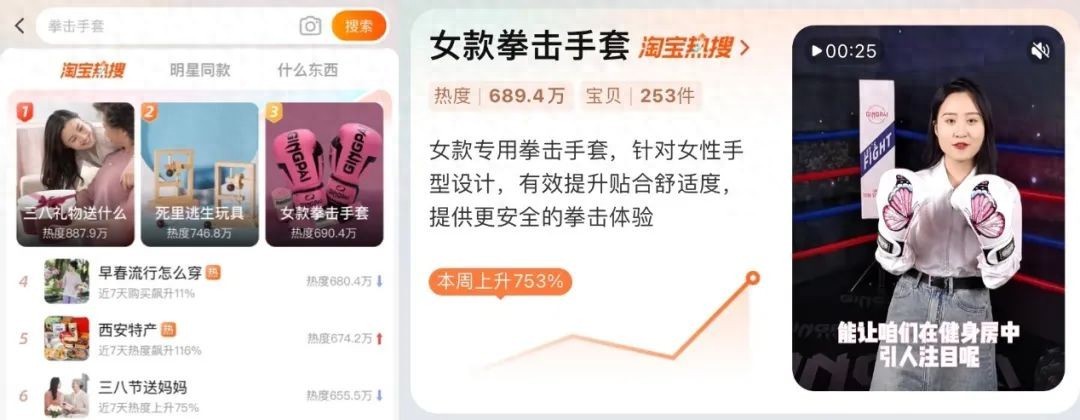 不过临近妇女节,淘宝热搜榜上出现了一样不同于刻板印象的内容:女款拳击手套。