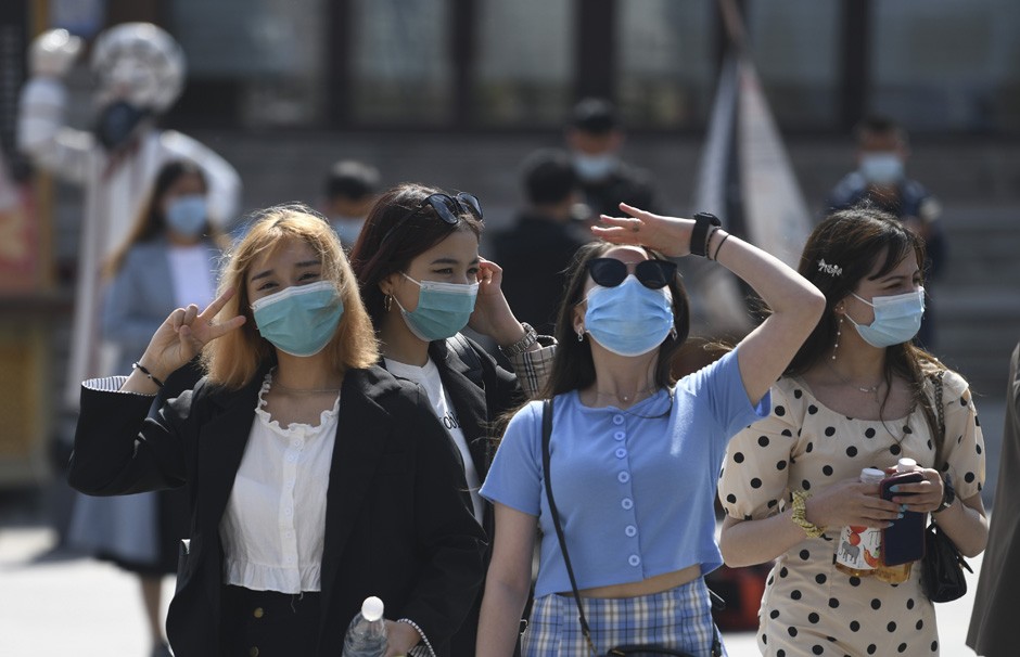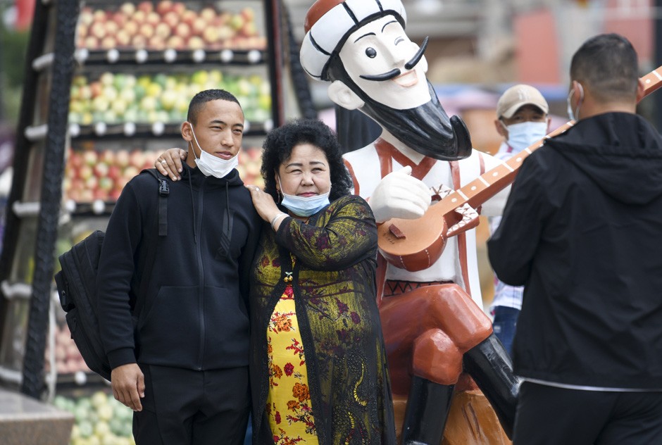 当天,新疆放假1天,全疆收费公路还对小型客车免收通行费,一些民众利用假期选择郊游、自驾游等。图为5月13日,人们在乌鲁木齐大巴扎景区留影。(图片来源:新华社)