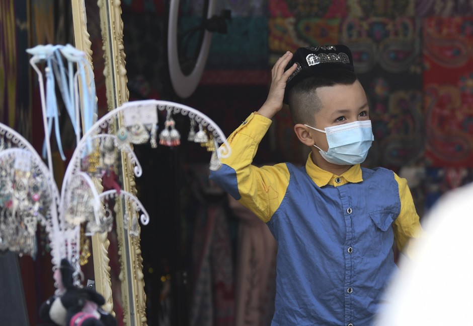 清晨,一些信教群众按照习俗参加会礼。会礼结束后,大街小巷洋溢着节日的氛围。在乌鲁木齐大巴扎景区、喀什市艾提尕尔清真寺门前广场等地,人们自发跳起欢乐的舞蹈共度佳节。图为5月13日,在乌鲁木齐大巴扎景区,一名小朋友试戴小花帽。(图片来源:新华社)