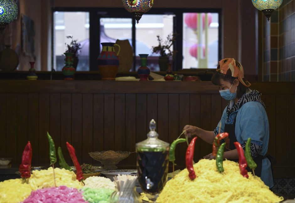 当天,记者在乌鲁木齐市新华南路沿街商铺、菜店、超市看到,市民纷纷走出家门采购节日物品。在乌鲁木齐大巴扎景区,还有不少外地游客一路观看少数民族歌舞表演、品尝新疆特色美食、游览购物,融入当地欢快的节日气氛中。图为5月13日,在乌鲁木齐大巴扎景区美食街,工作人员在制作美食。(图片来源:新华社)