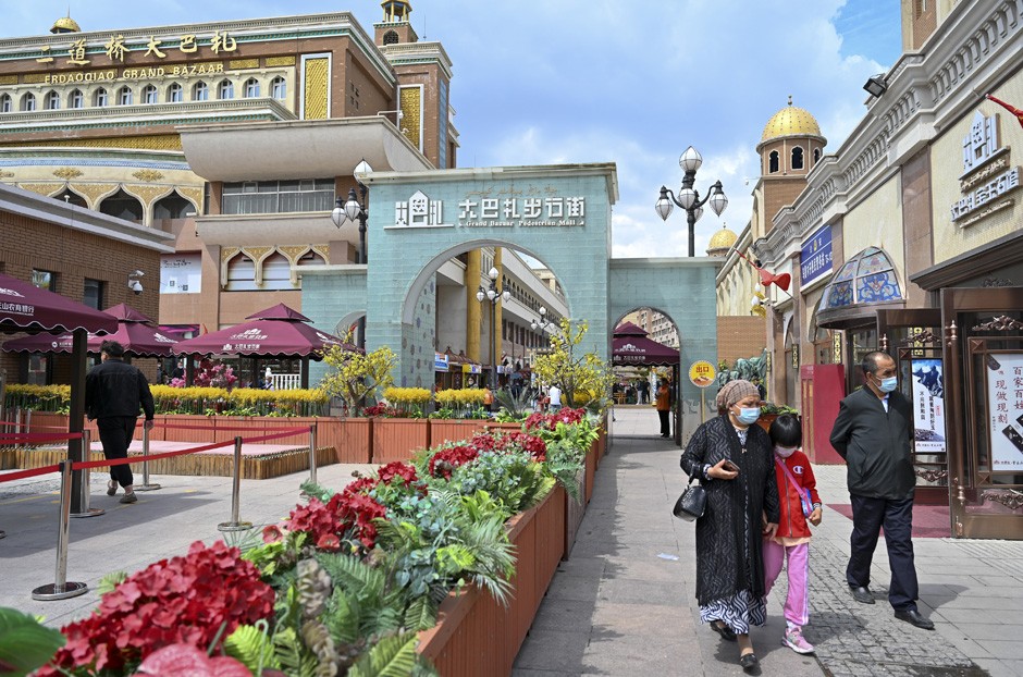 新疆吐鲁番市居民努尔比亚提前一天采购了各种干果、油炸撒子、糖果等节日物资,肉孜节这天,他带着礼品串亲访友。“我们放假一天,现在疫情防控措施到位,我们可以走亲访友,安心地过节了。”他说。图为5月13日,人们在乌鲁木齐大巴扎景区观光。(图片来源:新华社)