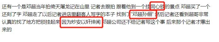 有记者爆料,在邓超拍《倚天屠龙记》时曾买过一个同心锁,还刻了字,他过了几年去这个店里才发现原来当年邓超刻的就是与孙俪两人的名字!当年的出轨安以轩简直就是无稽之谈。