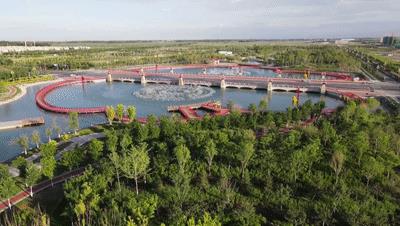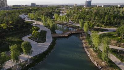 利用塔斯尔海水库及东西南北四条灌溉水渠引水入城穿城而过,双河市建立了横贯全城的水系景观带。
