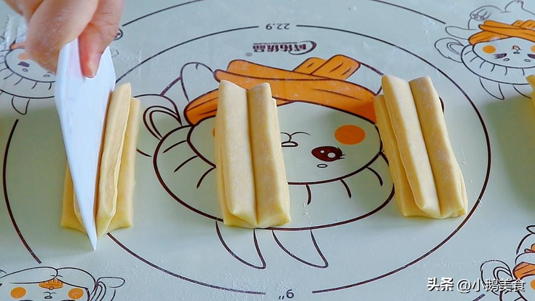 第六步,把有水线的面片放在下方,没有水线的面片放在上方,中间用刀背用力压一下,这样炸的时候不会散开。