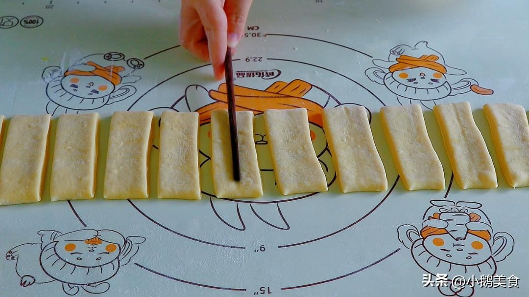 第五步,面团醒好后,在案板上撒一层薄薄的干面粉,把面团直接拿过来,放案板上,上面也撒一点干面粉防粘,不用擀,先捏住两端把它拉长,再拍扁一些,用擀面杖擀一擀,厚度大约五毫米即可,再切成两指宽的条状,每隔一条用筷子打上水线。