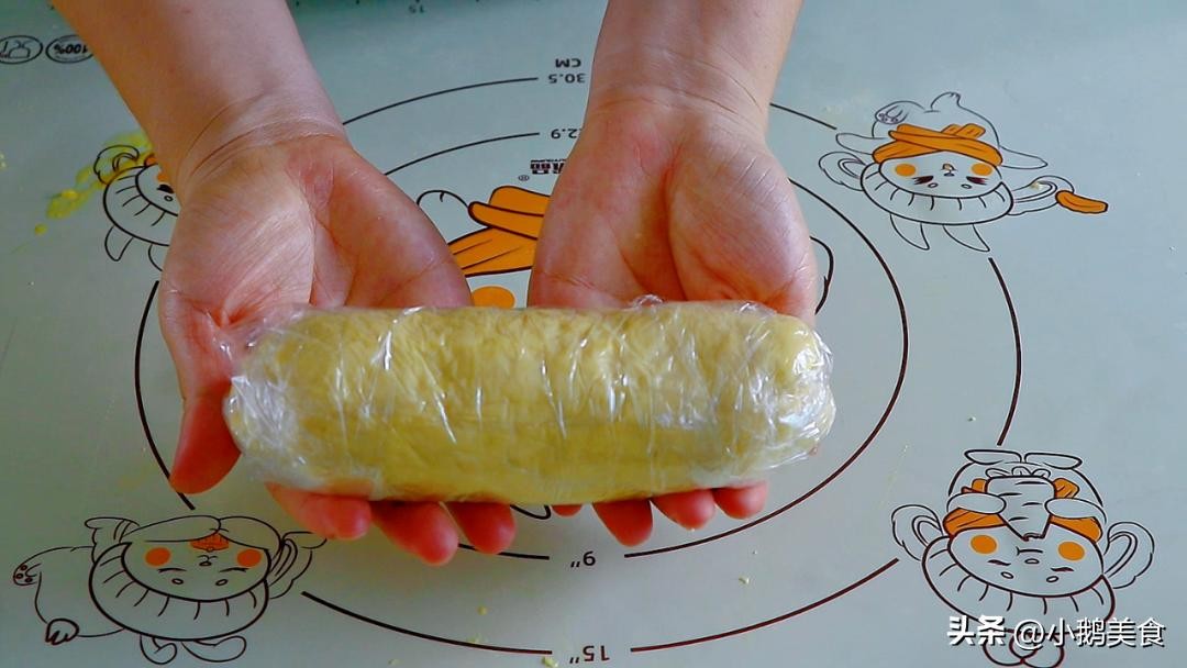 第三步,油条面不要揉,揉出来的面团会起筋,炸的油条就不够蓬松酥脆,甚至会发硬。全程采用折叠揣面的方式,这样可以减少面团起筋,油条更加蓬松酥脆。刚开始面团揣不光滑,可以盖上保鲜膜醒面20分钟,20分钟之后再给它折叠揣面。