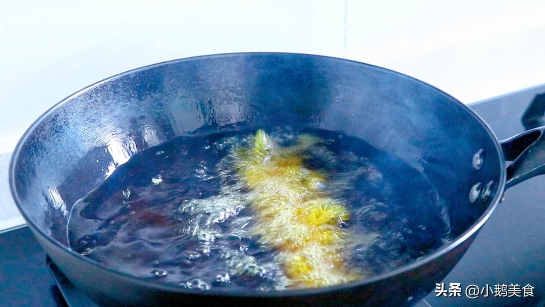 第八步,炸油条要用中大火炸,小火炸的油条会比较硬,凉了咬都咬不动,炸到金黄酥脆,不再变大,就可以捞出控油了。