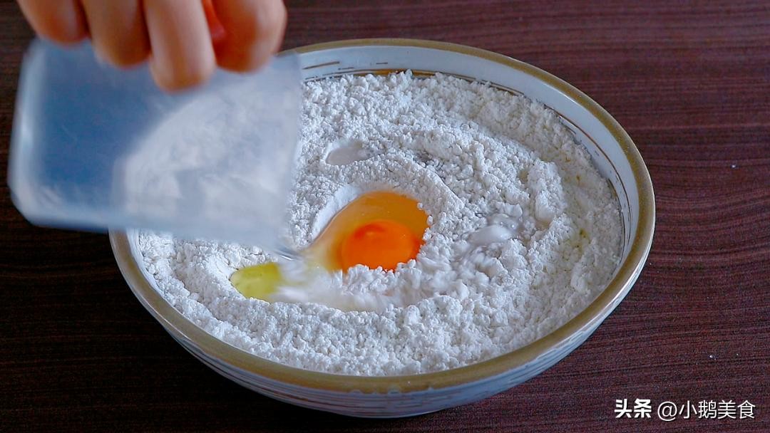 第一步,准备500克普通面粉,加8克盐,5克无铝泡打粉,3克小苏打,先把食材混合均匀。再加1个鸡蛋,口感更加酥脆,然后加入250毫升清水,这个含水量比商业版油条的用量少了一些,因此不会特别粘手,很适合新手操作。