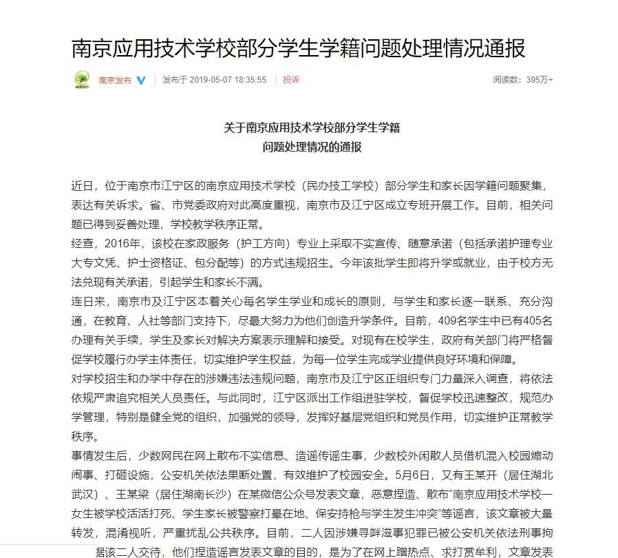 4月29日,南京人社局发布通报:南京应用技术学校于2015年租用南京东方文理专修学院校舍办学,在未报有关部门同意和备案的情况下,与南京东方文理专修学院签订了合作办学协议。2016年,南京东方文理专修学院以南京应用技术学校名义,采取不实宣传、随意承诺的方式(包括承诺护理专业大专文凭、护士资格证、包分配等),并以“零门槛入学”(即不论中考分数多少),实际招收家政服务(护工方向)专业学生。现由于无法兑现招生承诺,引发学生及家长强烈不满,进而导致此次事件发生。
