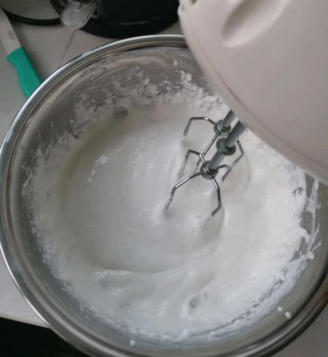 4. 经过1个小时,反复的用电动打蛋器打发,牛奶就开始形成淡奶油的雏形了,这大概是第4次搅打的样子。