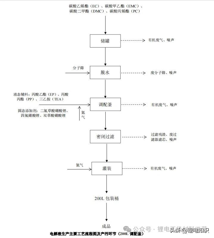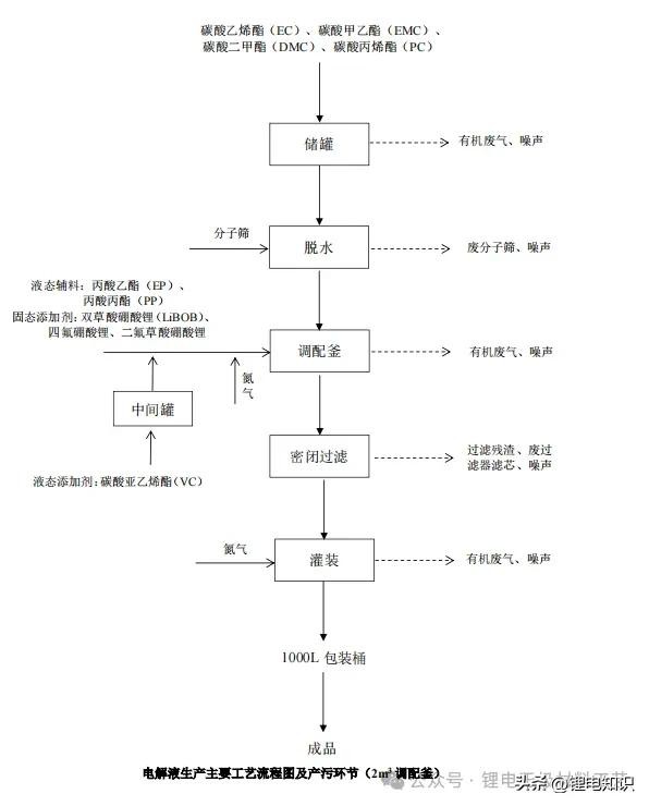 通过槽车运送到厂区,通过泵连接将碳酸乙烯酯(EC)、碳酸二甲酯(DMC)、碳酸甲乙酯(EMC)、碳酸丙烯酯(PC)送至厂区储罐储存,泵连接对应储罐,固态添加剂双草酸硼酸锂(LiBOB)、四氟硼酸锂、二氟草酸硼酸锂均密闭真空包装(袋装)的形式运送至厂区综合仓库,丙酸乙酯(EP)、丙酸丙酯(PP)、液态添加剂碳酸亚乙烯酯(VC)以密闭包装桶形式运送至厂区甲类仓库。电解液配制工序由多台调配釜及其它辅助设施组成,生产过程中均设有氮气保护,电解液车间采用净化车间标准。