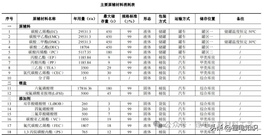 通过槽车运送到厂区,通过泵连接将碳酸乙烯酯(EC)、碳酸二甲酯(DMC)、碳酸甲乙酯(EMC)、碳酸丙烯酯(PC)送至厂区储罐储存,泵连接对应储罐。固态添加剂(二氟草酸硼酸锂、四氟硼酸锂、双草酸硼酸锂)密闭真空包装(袋装)的形式运送至厂区综合仓库,三乙胺(TEA)、丙酸乙酯(EP)、丙酸丙酯(PP)以密闭包装桶形式运送至厂区甲类仓库。