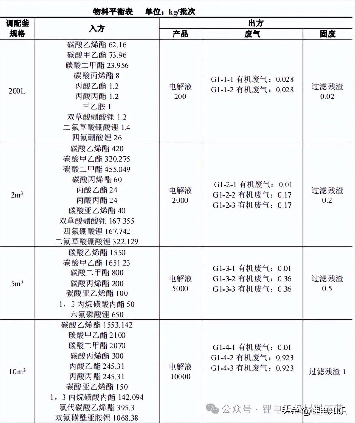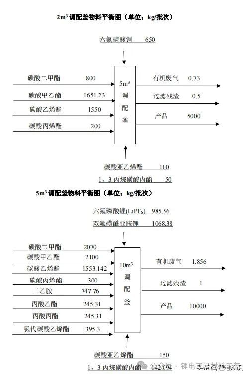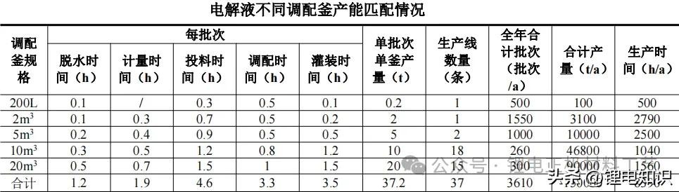 电解液配制工序由多台调配釜及其它辅助设施组成,其中调配釜有 200L、 2m3、5m3、10m3、20m3的 5 种规格,现以每种调配釜最常生产的电解液规格为例进行工程分析。不同规格调配釜产能匹配情况见下表。
