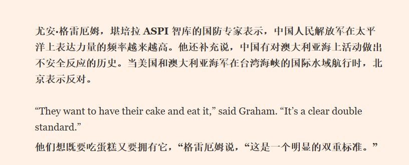另一家澳洲智库澳大利亚战略政策研究所(ASPI)的国防专家格雷厄姆(Euan Graham)则说,解放军在太平洋地区秀肌肉的频率越来越高了。“中国对澳大利亚在国际水域进行的合法海上活动曾有过‘不安全’的反应。每当美澳海军通过台湾海峡等国际水域时,北京都会提出反对。说白了,他们这就是宽己严人。中国人太卑鄙了,这就是赤裸裸的双标行为。”