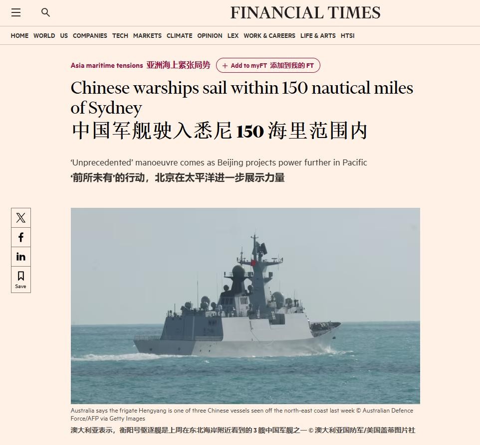 为什么我在这里要花这么长的篇幅和大家介绍一部澳大利亚的老剧呢?因为我最近在日资收购的英国老牌媒体《金融时报》上刷到了一篇新闻,说是澳大利亚军方近期在该国附近海域发现了一支中国舰队,该舰队在最近时距离悉尼仅有150海里(277.8公里),这在澳大利亚历史上还是头一遭。澳大利亚政府和西方媒体因此纷纷惊呼:“不好了!家人们!华人的军舰打过来了!”