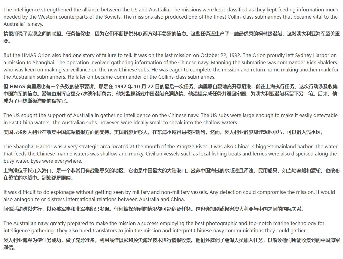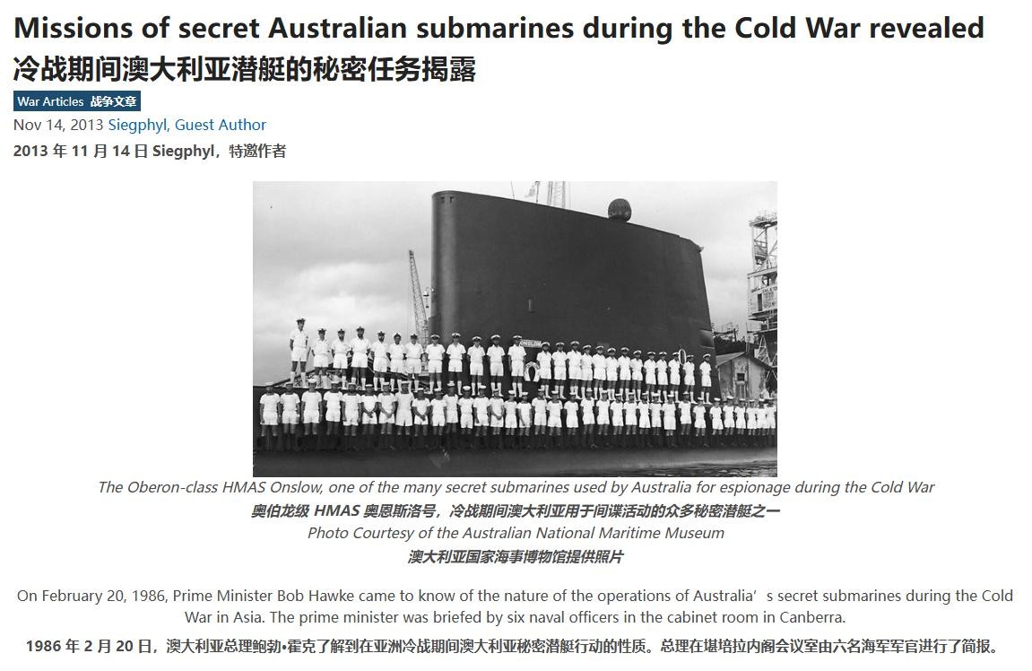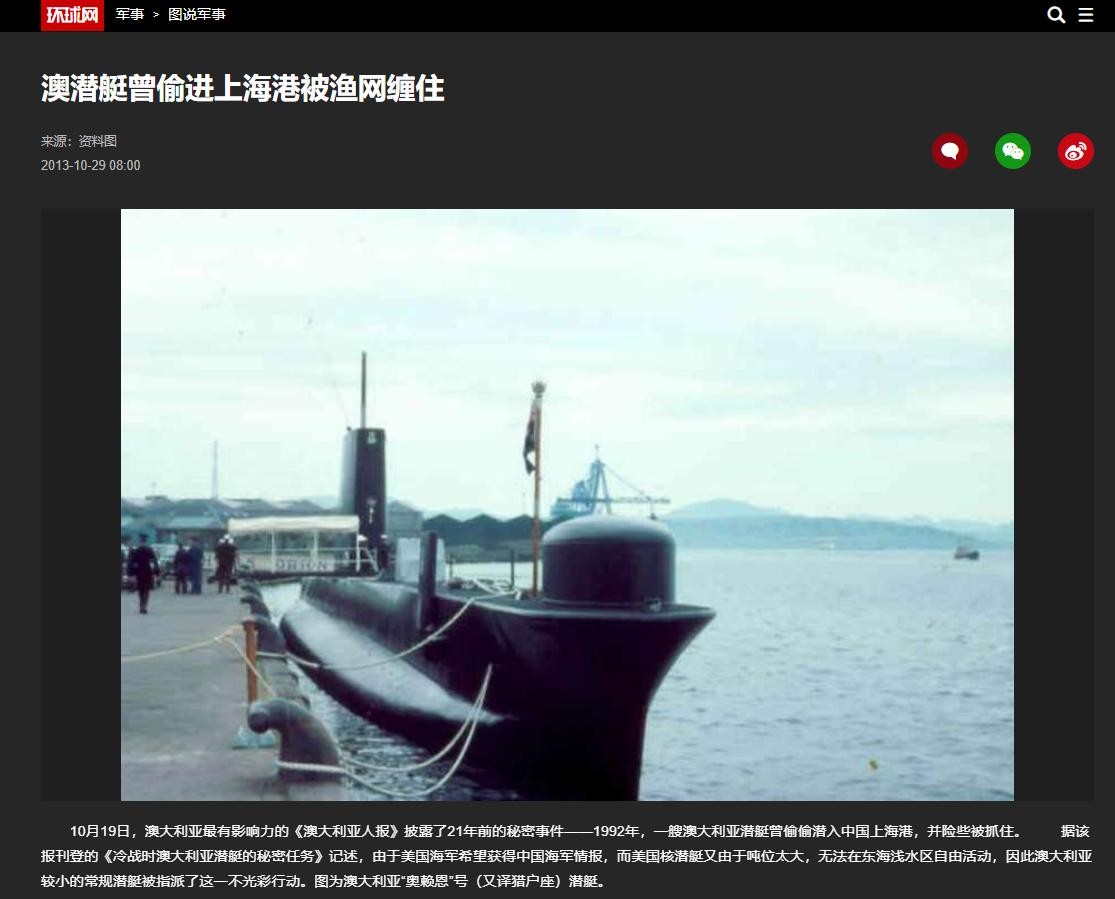 这“双标”二字,你们这些澳洲智库不说还好,一说我可就不困了。2013年10月19日,澳媒《澳大利亚人报》曾在一篇题为《冷战时澳大利亚潜艇的秘密任务》的报道中披露过一桩发生在1992年的往事:这一年的10月22日,澳大利亚海军的英制“奥白龙”级潜艇“猎户座”号试图偷偷潜入上海港,暗中搜集我人民海军新型潜艇的相关情报。