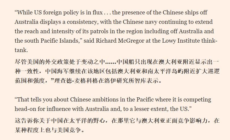 澳大利亚智库洛伊研究所(Lowy Institute)的研究员麦克格雷格(Richard McGregor)说:“现在的美国外交政策处于不稳定状态……而中国军舰出现在澳大利亚附近,表明中国海军将继续在南太海域增强其存在感。这表明了中国在太平洋地区日益膨胀的野心,它正在与澳大利亚——甚至在一定程度上正在与美国争夺南太影响力。”